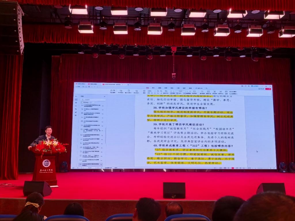 聚焦學風建設合力,服務學生成長成才。圍繞學風建設,與會教師認真學習了學校構建的“學生主體、班幹部引領、輔導員主抓、教師課堂主導、二級學院主責”五維學風建設體系,以及“四航”育人工作思路、“四個一”工程、“312”養成教育工程等具體舉措。學以緻用,重在行動。優良學風是人才培養質量的重要保障,作為專任教師,要切實發揮課堂主導作用,将價值引領、知識傳授與能力培養有機結合,與學工隊伍形成育人合力,共同營造“勤學、善思、務實、創新”的濃厚學風。