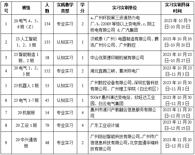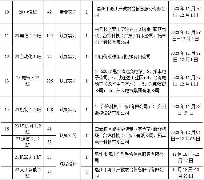 我院2023-2024學年第1學期實踐教學的校外基地使用情況見表2,2023-2024學年第2學期的實踐教學的校外基地使用情況見表3,這學期重點利用了惠州源川産教融合信息服務有限公司的實踐資源條件,從第3周起每周(第9周除外)有至少2個班的學生在基地實踐,是使用率最高的實習基地。2024-2025學年第1學期的實踐教學的校外基地使用情況見表4,這學期在實習基地共開展實踐教學活動62批次,基地接納學生2678人次,滿足了實踐教學計劃的需要,實習基地的總體使用較好。