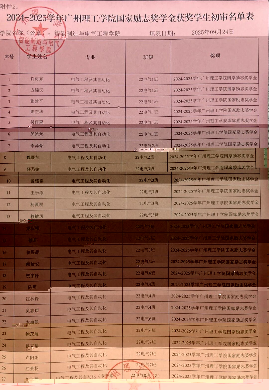根據《關于開展2024-2025學年國家勵志獎學金評選工作通知》(廣州理工學助函〔2025〕11号),經學生本人申請及學院評議,現将我院2024-2025學年國家勵志獎學金拟推薦名單在學院校園網主頁、學院公衆号予以公示。公示時間從2025年9月24日至2025年9月26日止。公示期間,任何個人和單位均可通過來信、來電、來訪等形式向學院反映公示對象的情況和問題。反映情況時請簽署真實姓名和聯系電話,有具體事實;匿名将不予受理。